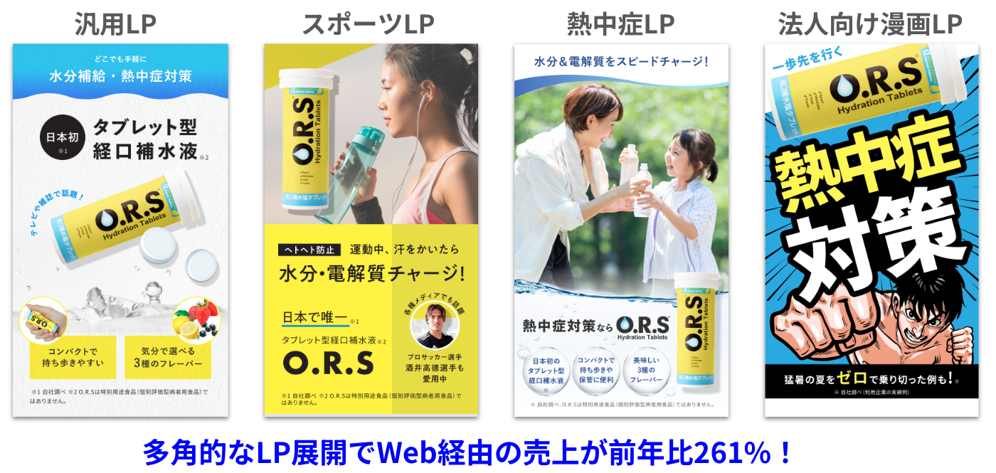 この要因は、AIR Designと共に、ターゲットごとに解像度の高い仮説を立て、LPを多角的に展開できたことにあります。汎用的な内容だけでなく、「熱中症対策」「スポーツ」「法人向け」とシーンを切り分け、それぞれのターゲットに刺さる言葉とデザインを検証し続けました。漫画形式のLPなど、自分たちでは思いつかないような切り口にも挑戦できたのは、AIとプロチームならではの強みだと思います。